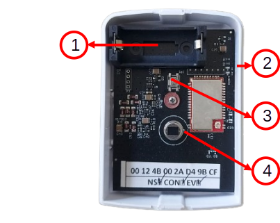 3- Con el botón #1 presionado, inserte la pila nueva en el soporte. El LED del sensor debe parpadear en rojo